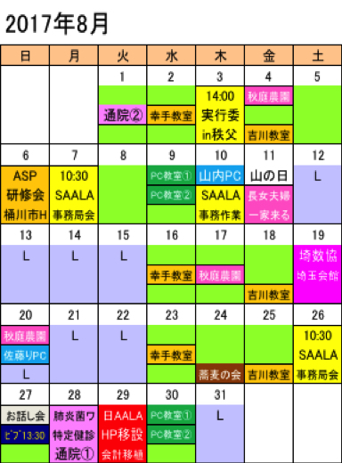 アスポート教室は幸手は8月のみ(13:30-16:30)勤務 アスポート教室は吉川は(18:00-20:30)勤務 Lは、みなかみ町赤谷にて田舎暮らし ビブリオバトルは、普及委員として活動 通院→@内科A皮膚科B歯科C接骨院D耳鼻科E眼科