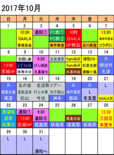 アスポート幸手教室は(17:30-19:30)勤務 Lは、みなかみ町赤谷にて田舎暮らし ビブリオバトルは、普及委員として活動 通院→@内科A皮膚科B歯科C接骨院D耳鼻科E眼科
