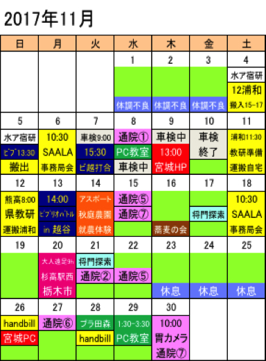 アスポート幸手教室は(17:30-19:30)勤務 Lは、みなかみ町赤谷にて田舎暮らし ビブリオバトルは、普及委員として活動 通院→@内科A皮膚科B歯科C接骨院D耳鼻科E眼科F総合病院